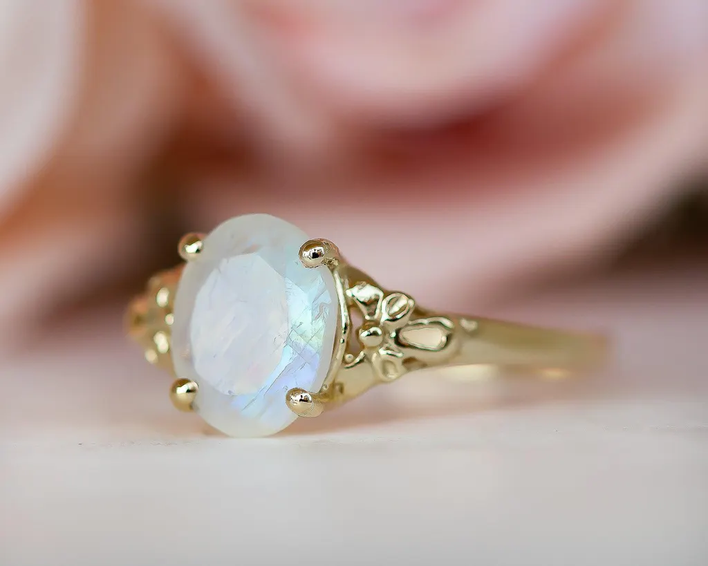 This dainty ring has a feminine design, a floral vintage style set with an oval-shaped rainbow moonstone that symbolizes passion and endless love.